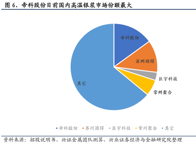 目前国内四大银浆厂商的高温银浆市场份额合计不足35%,市场竞争相对激烈。其中帝科股份占比最大约13%左右,苏州固锝市场份额超10%。除此之外,国际四大银浆企业等由于成本和技术升级问题,正逐步被国内龙头所替代。
