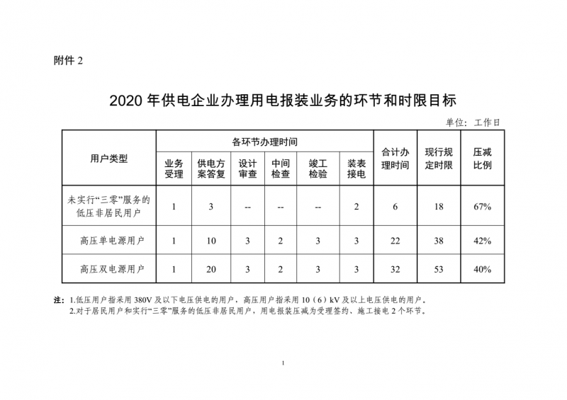 ——办电更省时。2020年底前,将低压、20kV及以下高压电力接入工程审批时间分别压减至5个、10个工作日以内;将供电企业办理用电报装业务各环节合计时间在现行规定基础上压缩40%以上(详见附件2),未实行“三零”服务的低压非居民用户、高压单电源用户、高压双电源用户的合计办理时间分别压减至6个、22个、32个工作日以内;将居民用户、实行“三零”服务的低压非居民用户从报装申请到装表接电的全过程办电时间分别压减至5个、25个工作日以内。2021年、2022年底前,将实行“三零”服务的低压非居民用户全过程办电时间进一步分别压减至20个、15个工作日以内。