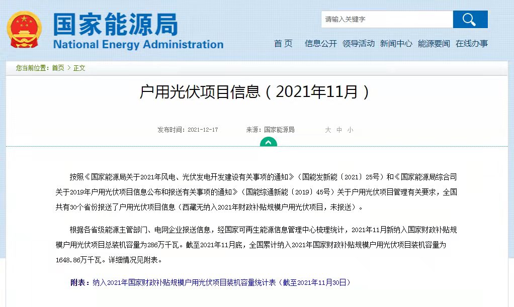 根据各省级能源主管部门、电网企业报送信息,经国家可再生能源信息管理中心梳理统计,2021年12月新纳入国家财政补贴规模户用光伏项目总装机容量为508.98万千瓦。截至2021年12月底,全国累计纳入2021年国家财政补贴规模户用光伏项目装机容量为2159.62万千瓦。详细情况见附表。