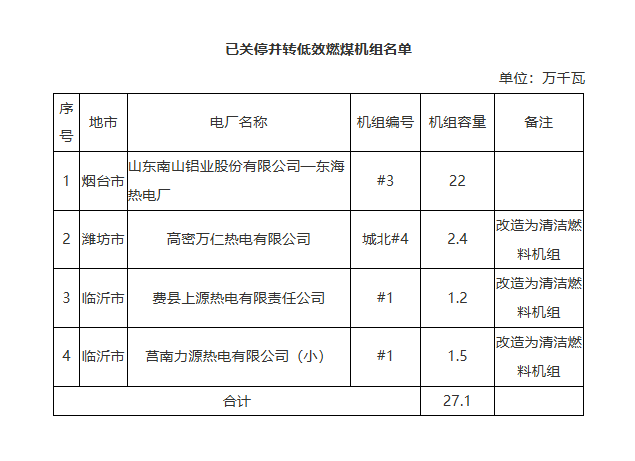 1月20日,山东省能源局发布关于烟台、潍坊、临沂市2024年已关停并转低效燃煤机组名单的公示,4台共27.1万千瓦机组关停,详情如下: