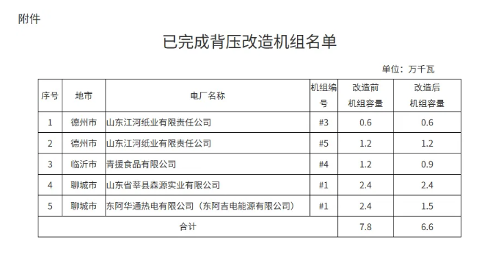 关于德州、临沂、聊城市2024年已完成背压改造机组名单的公示