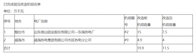山东省能源局日前发布关于烟台、威海市已完成背压改造机组名单的公示,详情如下: