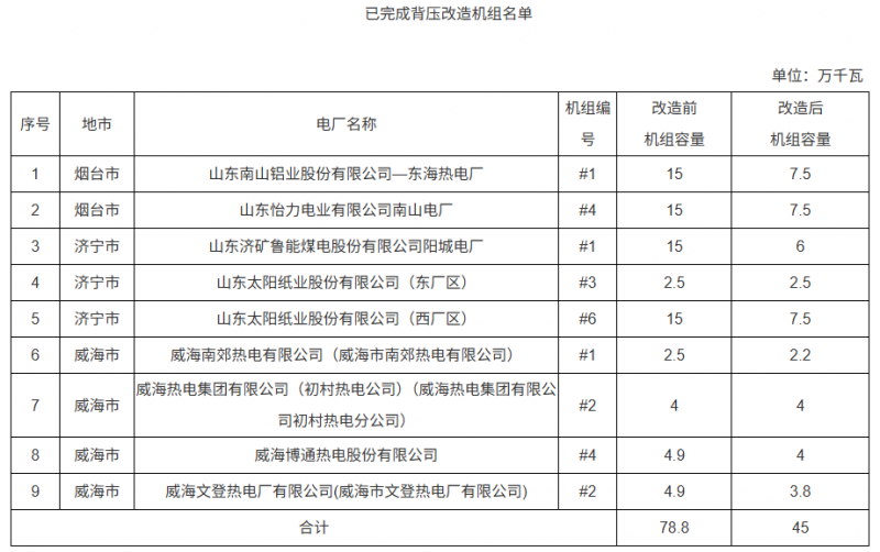 近日,山东省能源局发布关于烟台、济宁、威海市已完成背压改造机组名单的公示,详情如下: