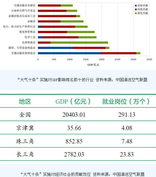 报告显示,“大气十条”的实施在拉动经济的持续发展、拉动内需、解决社会就业等方面起到较为积极的经济贡献。GDP、居民收入和就业受益最大的行业是交通设备制造业、通用专用设备制造业和农林牧渔业;金属冶炼及压延加工业、化学工业、金属制品业、批发和零售业、金融业、教育业和交通运输及仓储业等行业在各项指标中同样属于受益较大的行业。