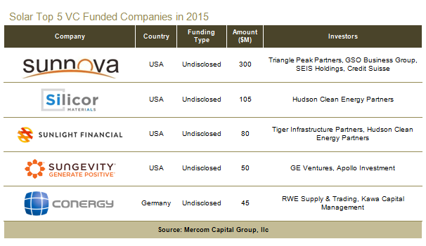 美国清洁能源通信和咨询公司Mercom资本日前披露2015年太阳能领域融资数据称,2015年,全球太阳能领域融资(包括风投/私募、债务融资、公开市场融资)金额达到253亿美元,同比下降4.5%。