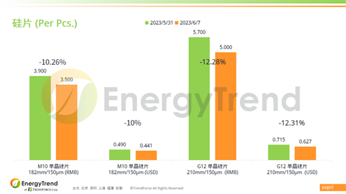 M10单晶硅片人民币报价从 RMB3.9/Pc 掉落至 RMB3.5/Pc,跌幅为 10.26%;美金报价为 US$0.441/Pc,变动幅度为 -10%。G12单晶硅片人民币最新报价为 RMB5/Pc,较前一周减少了12.28%;美金报价从 US$0.715/Pc 下跌 12.31%,掉落至 US$0.627/Pc。