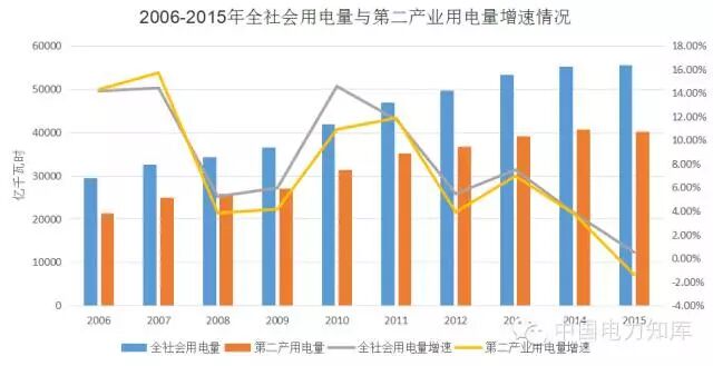 2015年我国全社会用电量为55500亿千瓦时,同比增长 0.5%;其中,一产用电量为1020亿千瓦时,同比增长2.5%;二产用电量为40046亿千瓦时,同比增长-1.4%;三产用电量为7158亿千瓦时,同比增长7.5%;居民生活用电量为7276亿千瓦时,同比增长5%。