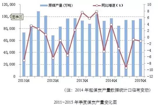 2015年,我国煤炭产量连续第二年负增长。据测算,2015年全国原煤产量为36.8亿吨,同比下降3.5%。其中一季度为8.47亿吨,二季度为9.42亿吨,三季度为9.36亿吨,四季度为9.6亿吨,分别同比下降3.5%、9.48%、0.74%、1.15%。