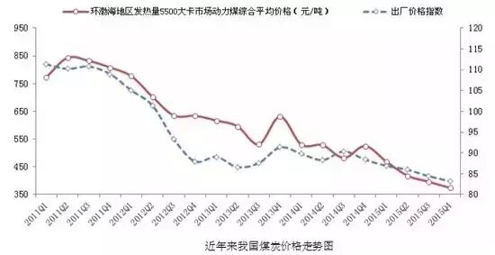 在下游产业低迷、供需严重失衡以及市场恶性竞争的背景下,2015年煤炭价格一路下滑。至年底,环渤海5500大卡动力煤综合平均价格跌至372元/吨,较上年同期下降153元/吨,下跌29%;生产者出厂价格总水平收至83.2(以上年同期为100),同比下跌5.2个百分点。